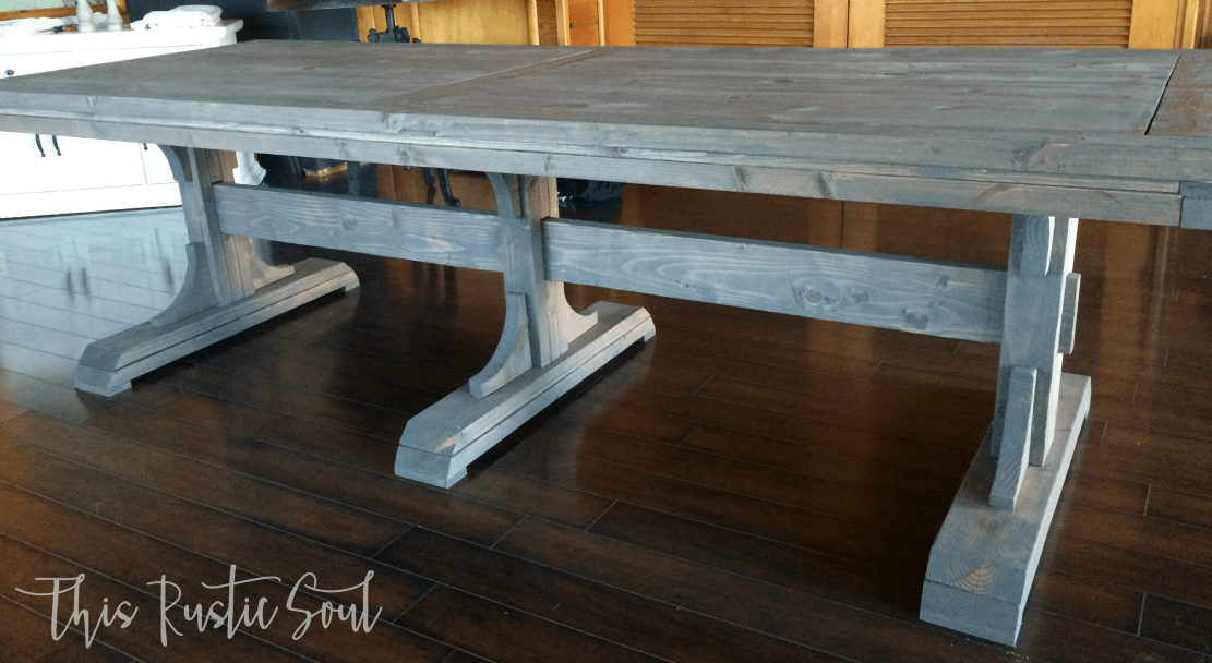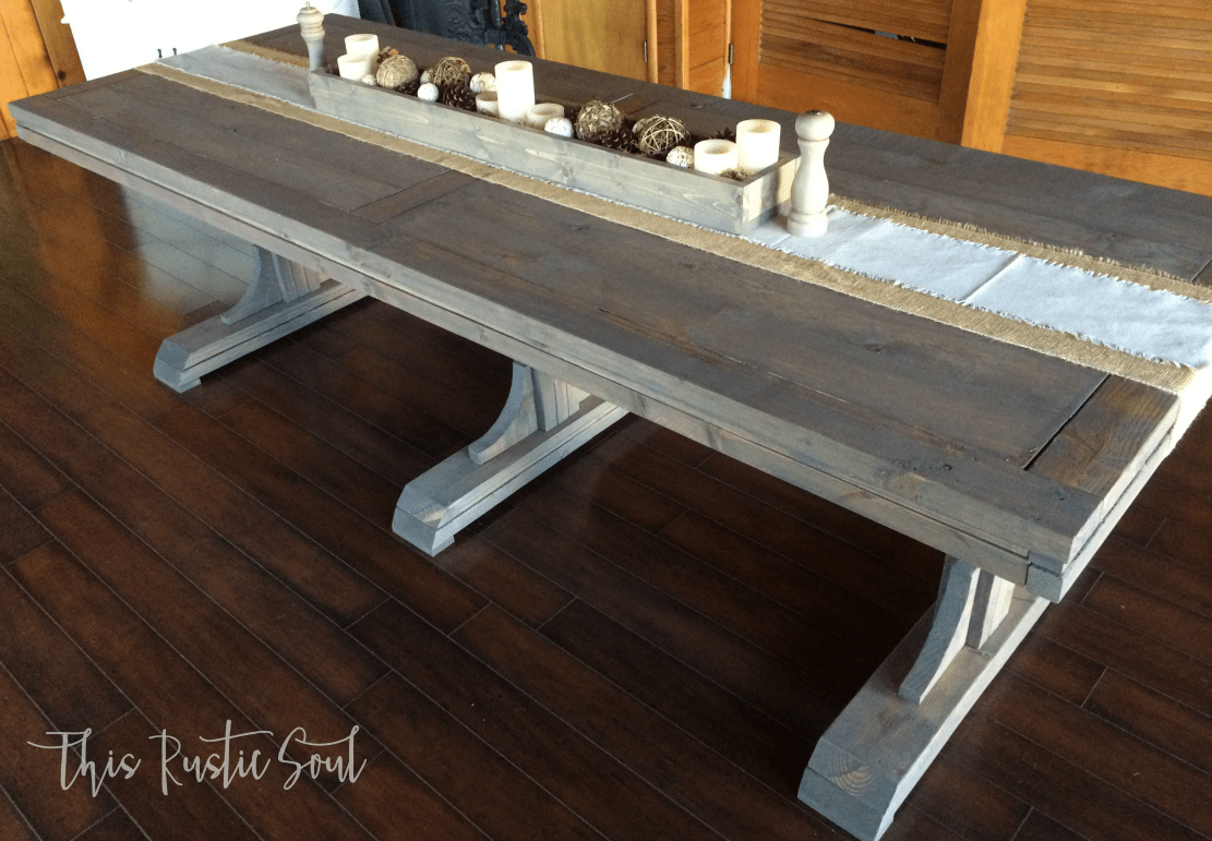 I searched for a long time to find the perfect farmhouse table that spoke to me and when I found this one, it pretty much screamed in my face and I knew, I had to have it. I was incredibly intimidated because it looked so much more intricate than your basic farmhouse table, but seriously, it was just the right amount of challenge that I was looking for. You can build this table! These awesome gals came together to create this amazing, rustic, farmhouse table. See their plans here and here. They both have fantastic, step by step, instructions to build by.