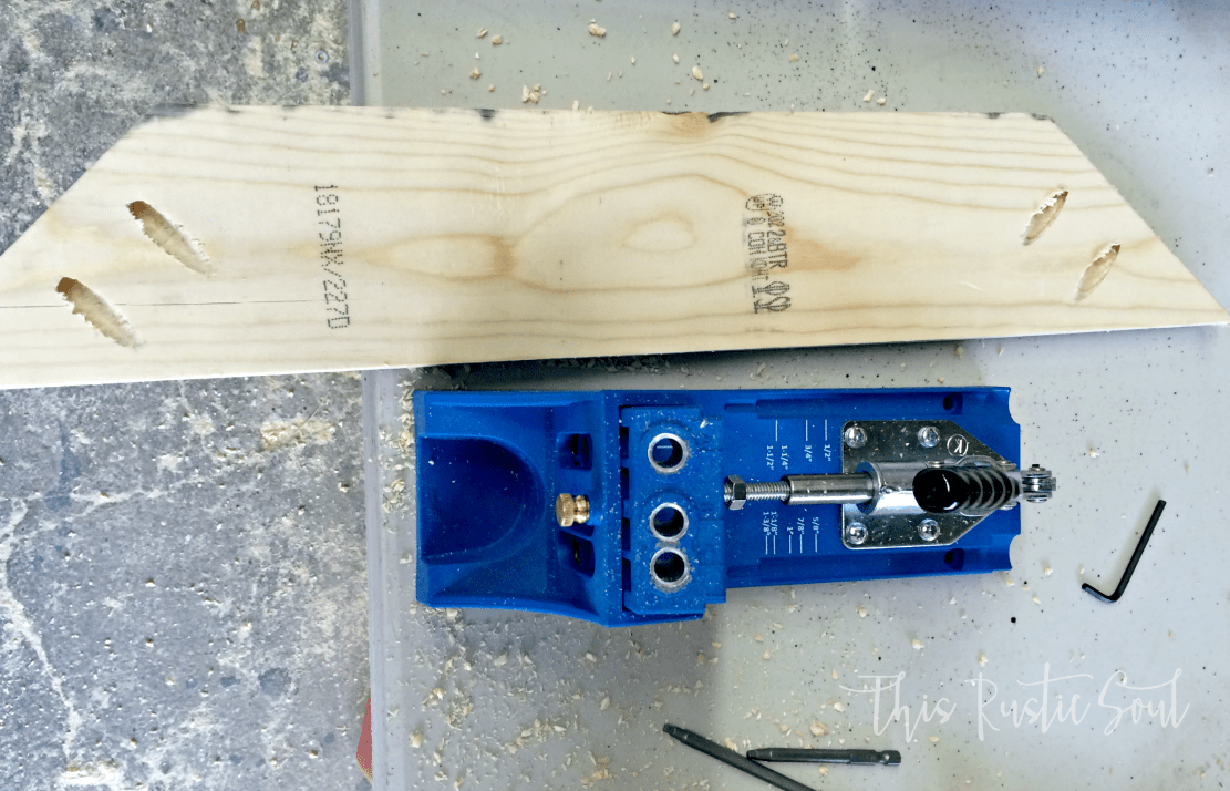 Alright!!  Now, you are going to use that handy dandy Kreg Jig.  I have to say, I was a little intimidated by this contraption, because yes, I’m still a newby in this whole wood working land…BUT once you know how to work this machine it is fantastic!  Give it a chance, you will be super excited.  I drilled my pocket holes in the back of my 22.5″ boards.  If you don’t have a Kreg Jig, you can definitely still countersink your screws.