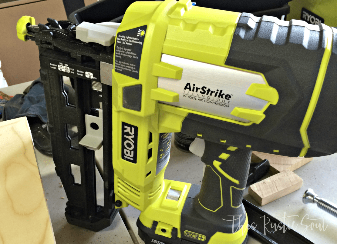 Use your wood glue to glue the pieces together, then use your nail gun to seal the deal.  You can use wood filler later to cover the holes, but this project was supposed to look old, so I left the nails showing.  I used my Ryobi 18-Volt One+ AirStrike 16-Gauge Cordless Nailer because, well, it’s totally the best!!  Seriously guys, I’m not sponsored (yet!) by any of the companies or products I will talk about in my posts, I just love them so I think they deserve my praise.