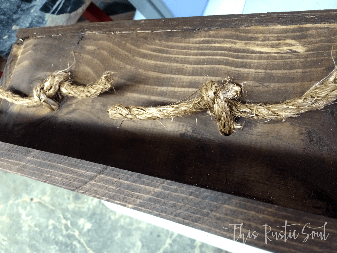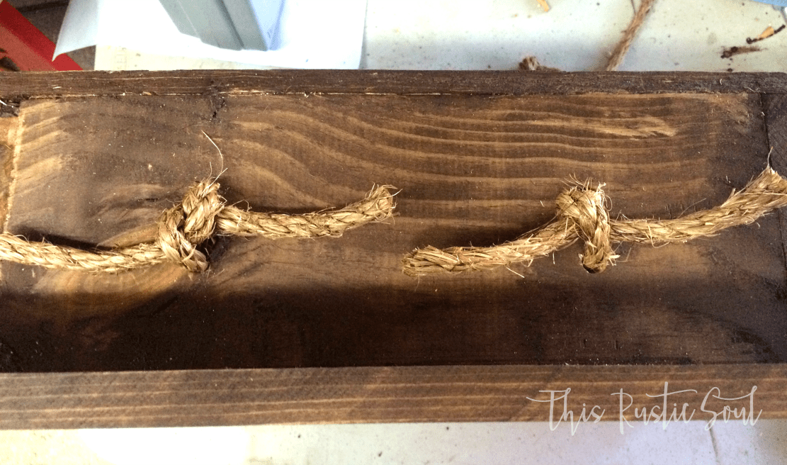 Next, you will need to drill the holes for the rope to hang your piece.  I believe I used half inch rope so I used a half inch drill bit to drill my holes.  However, I now recommend using a slightly larger drill bit to drill your holes so that your rope is easier to pull through.  Once you tie the rope in a knot you won’t see the holes.  The length you cut the rope really depends on the subject you are going to put in it.  Just measure where you would like your subject to sit inside the box, and cut the rope accordingly.